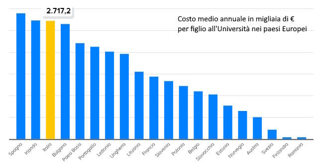 Gli studi universitari, infatti, succhiano da soli il 61,3% di tutta la spesa privata delle famiglie italiane in istruzione: 5 miliardi e 579 milioni di euro. Praticamente avere un figlio all’Università costa 2.717 euro a studente, al netto di borse di studio e sussidi. Se escludiamo il Regno Unito, in cui l’istruzione terziaria segue un modello più simile a quello americano, solo in Spagna e Irlanda le famiglie pagano di più.
